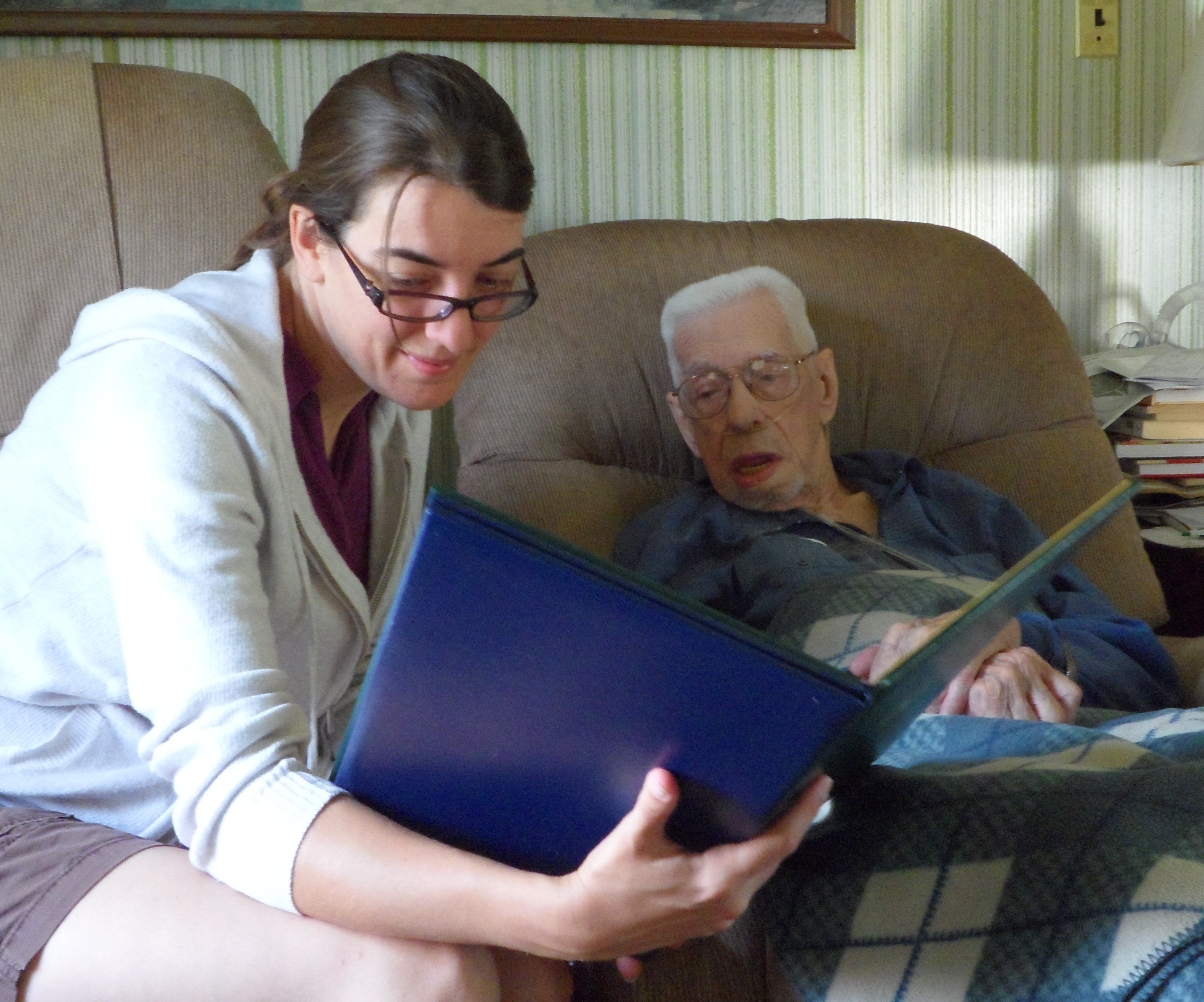 This is my dear uncle with ( I’m pretty sure) his two youngest descendants, my granddaughters Ginney and Sophia. Also his birthday cake with sparkler and a bowling trophy on his hundredth birthday.