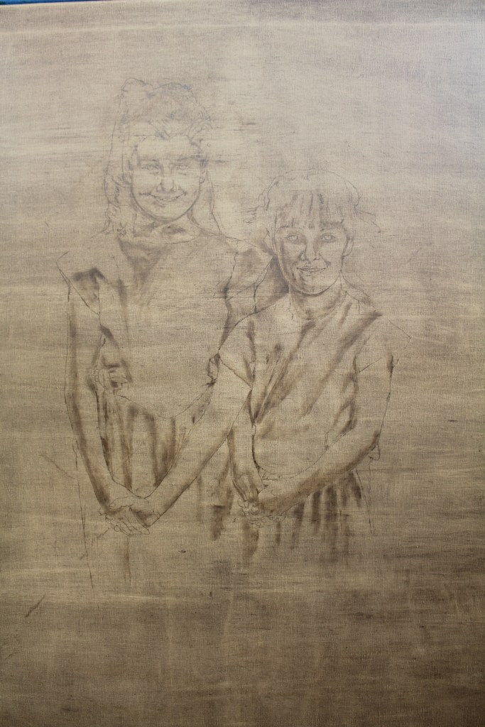 Everything I touch today has turned to mud, although I am pleased with my first pass on this new painting entitled SISTERS. Even here on my blog, I opened it this evening, hoping to relax and communicate with all my friends, but instead I find that everything has changed. I used up half an hour trying to put in a new photo and finally got it. Then, I tried this typing and it keeps throwing up blocks or some strange information that is not helpful at all. I will try to stumble on but even starting a new paragraph causes me headaches. I have no idea what has messed this up but it will not let me start a new paragraph so I will just run all my sentences together. Sorry. The summer has been full of challenges. I don’t want to list a bunch of problems here so let me just say that I have not been working continually, for many reasons, and now when I am trying to get back to work, stuff keeps getting in my way, now, even my word press blog is not responding. Anyway, today I could not seem to get into this new painting. Hours went by with one interruption after another and finally I just decided I was going to get started with the sketch transfer, no matter what happened. This is a job that should not be stopped in the middle. By the time I got my work set up and ready to go, my hands were shaking badly. They still are. I am surprised I got the work this far. But this is the place in the process where it is important to get the likenesses. For this painting, the photo references are very blurry but I have always loved this image. I searched through many photos of my two youngest girls to find what would help me get good sketches as close as possible to the original. I have worked on the sketches for weeks. When transferring, the likenesses must be done with precision. Having a case of tremors does not help. Once the transfer is made, I like to use a soft sable brush to turn lines into planes. This is where I begin to finess the skin tones. Yes, I start planning the end of the painting from this early beginning. So, I did not complete the bottom of the painting but I can tell already that I have what I need.