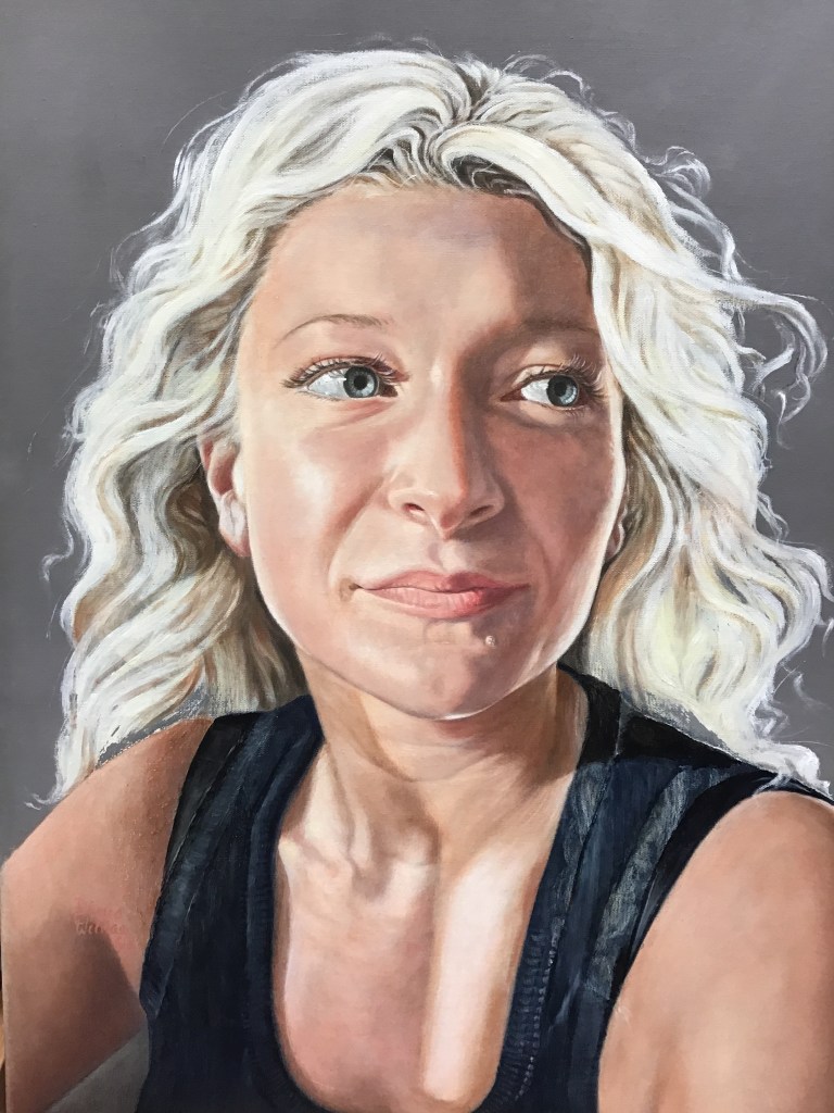 Even though I have done some detail on eyes, there are still many layers of flesh to perfect the skin tone and correct the likeness. Now I am going to show you a portrait of her that she hates. I will give you more info.I tell my students, if it doesn’t look right, it is just not finished yet. This is a good example. I have repainted and over layered so many times. But nothing helped my dear Grand daughter like this. I even changed the hair so that it went from medium to long ringlets down in front of her shirt. It hung on my studio wall for over a year and finally I repainted another layer. Still that didn’t help so I was ready to call it a failure. I just couldn’t do that. I said to myself, it just isn’t finished yet! I began a process of repairing by removing the hair over her shirt. I have no idea if I can fix it but I am going to give it my best try. well, keep in mind, I won’t be checking in for up to a month and then Bruce will have another surgery, which could be quite serious. Don’t give up on me. I will get back as soon as I can. Shalom.