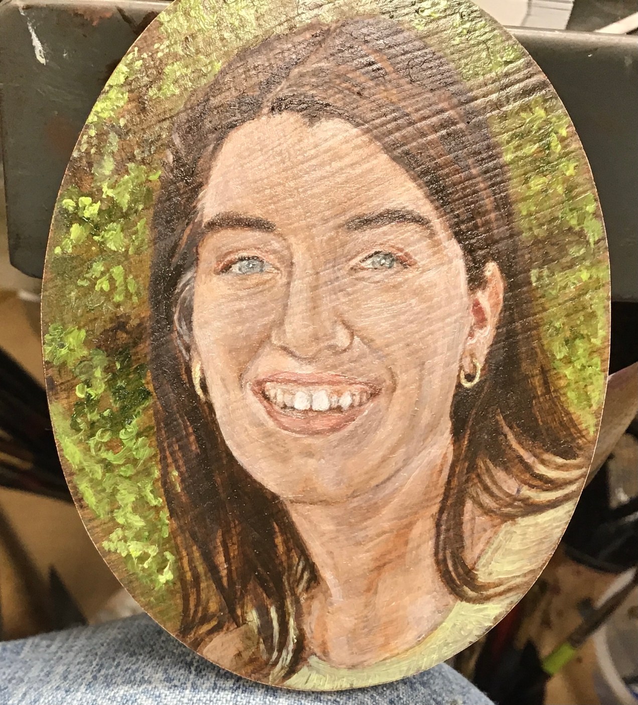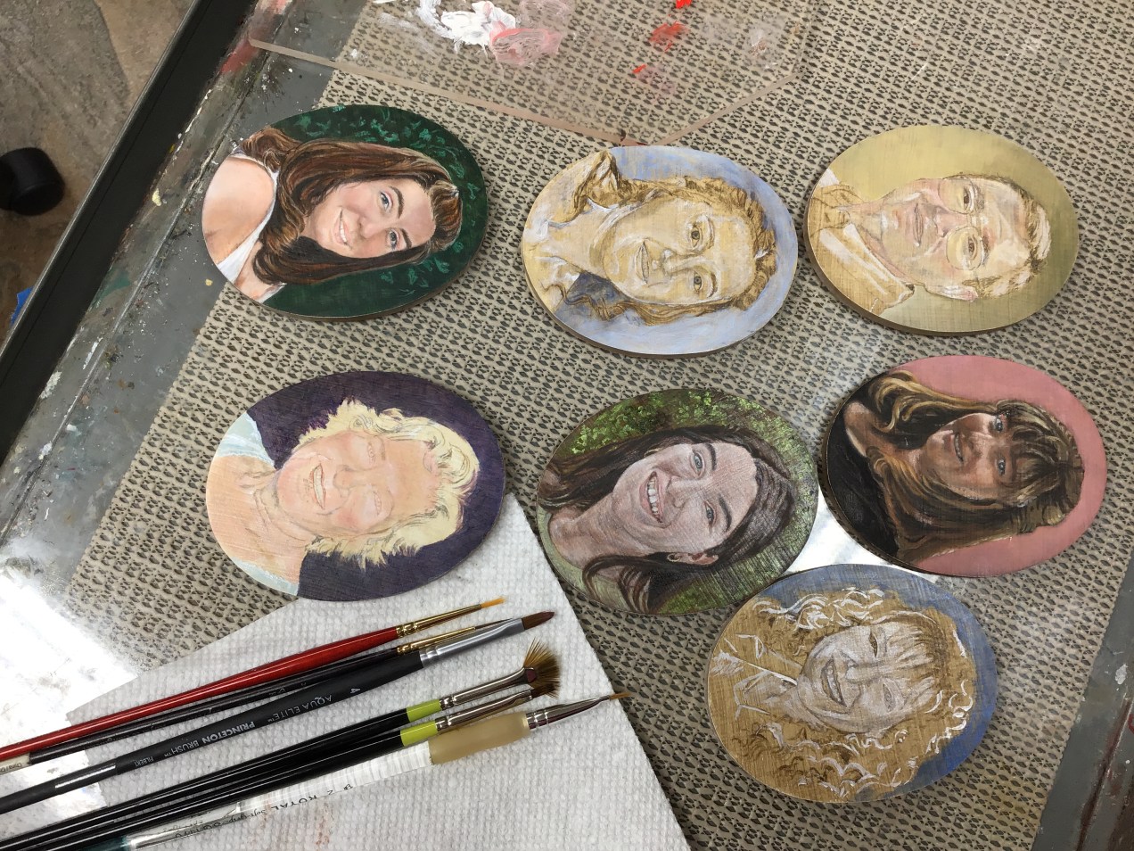 I needed a break from the birthday painting so I brought out these miniatures that I started at least five years ago. They are my husband and myself and our five daughters. I have wanted to do these for longer than I have been painting. I bought the first set of frames before I had ever lifted a brush and found the second set at an antique store. After I chose the images and began the work, it proved to be too difficult because of the tiny work and my tremor. About a year ago I ordered a gadget I saw on line that works like binocular glasses. The vision is wonderful. My doctor prescribed a medicine to aid in calming my tremor. I don’t use it for regular work but for this, it really helps. There is something about these images as a group that makes me really happy. I hope I can complete them each with a good likeness and artistic skill. The hours fly by when I work but more so with this miniature challenge. It must be some sort of time warp. Enjoy your painting. Diana