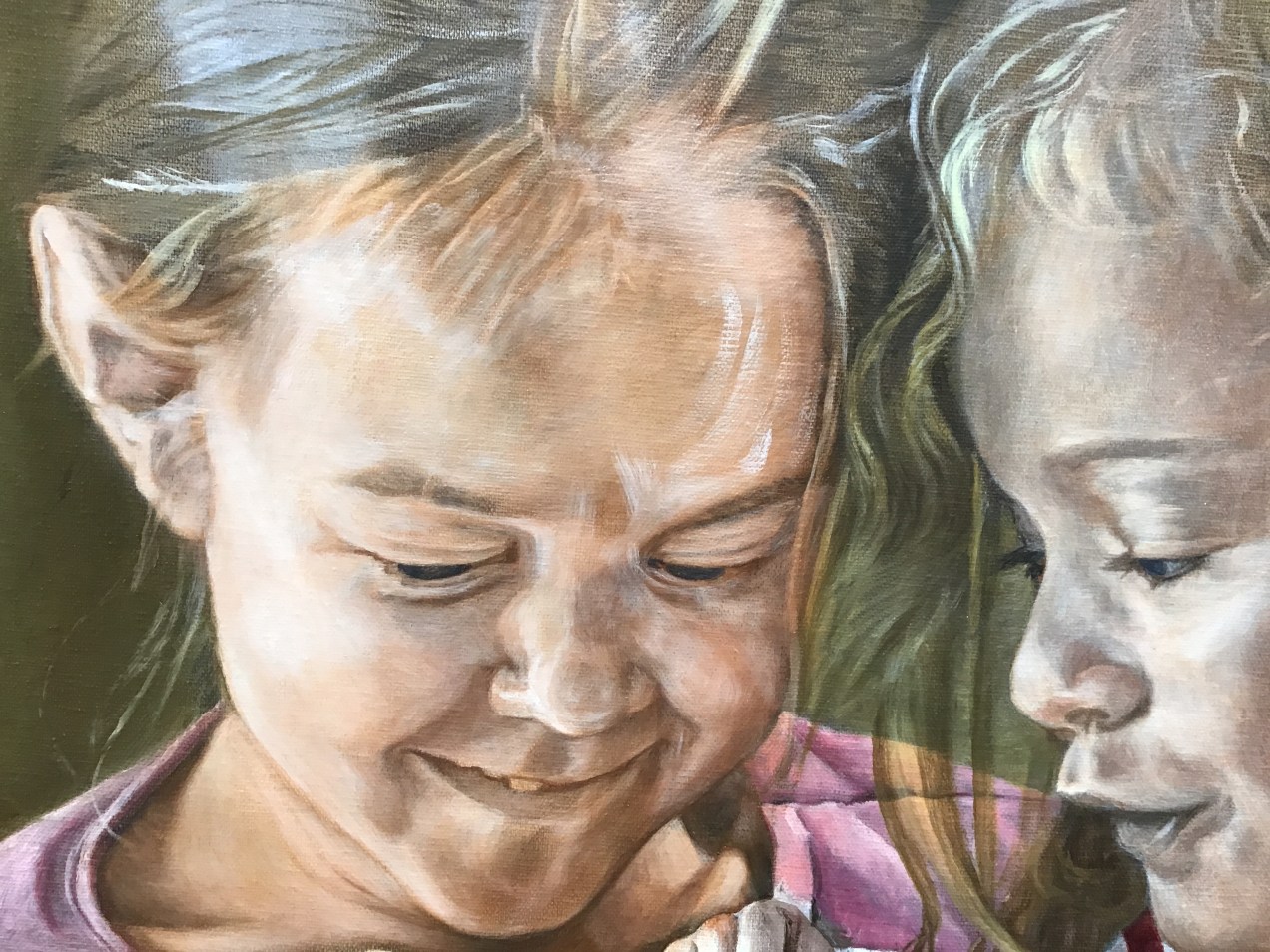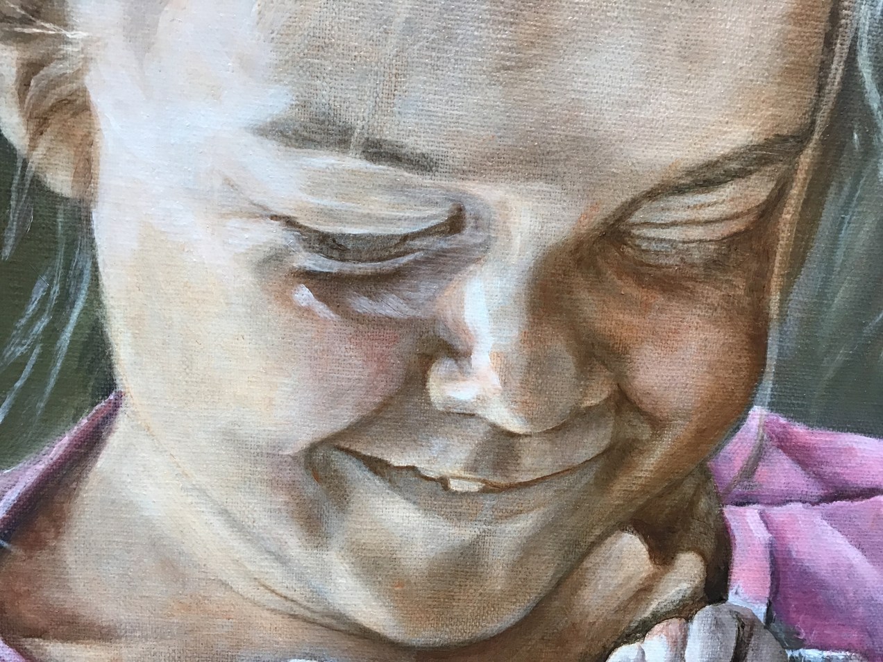 Strange day. Reminiscent of the flood of 77. Hurricane rain, dams overflowing and reports of dams breaking. Here beside the Conemaugh River we have frequent floods in certain places but since our area is hilly, to say the least, most places just get runoff in their basements. If the River is high enough to flood, you know there is a lot of water. Today, the painting I did was interrupted often by calls asking about our safety. I have such a desire to paint, but never seem to get much done at one time. This is the main reason I use the methods I do in order to make the most of short bursts of energy or short amounts of time available. My grasaille is almost complete. I used a flesh tone to deepen the areas in shadow and to make small corrections on the features. Beginning artists in realism don’t seem to see all the detail that will eventually bring their painting to that ‘wow’ place. And it is a factor of seeing, rather, noticing. We must learn to look into the dark spaces, or even into the light to see things that will catch the viewers attention. One thing about painting in tiny bits like this, it is truly like a puzzle; all of a sudden the final piece goes in and it’s done. HalleluYah!