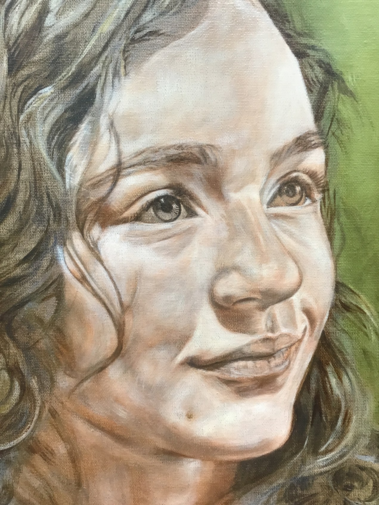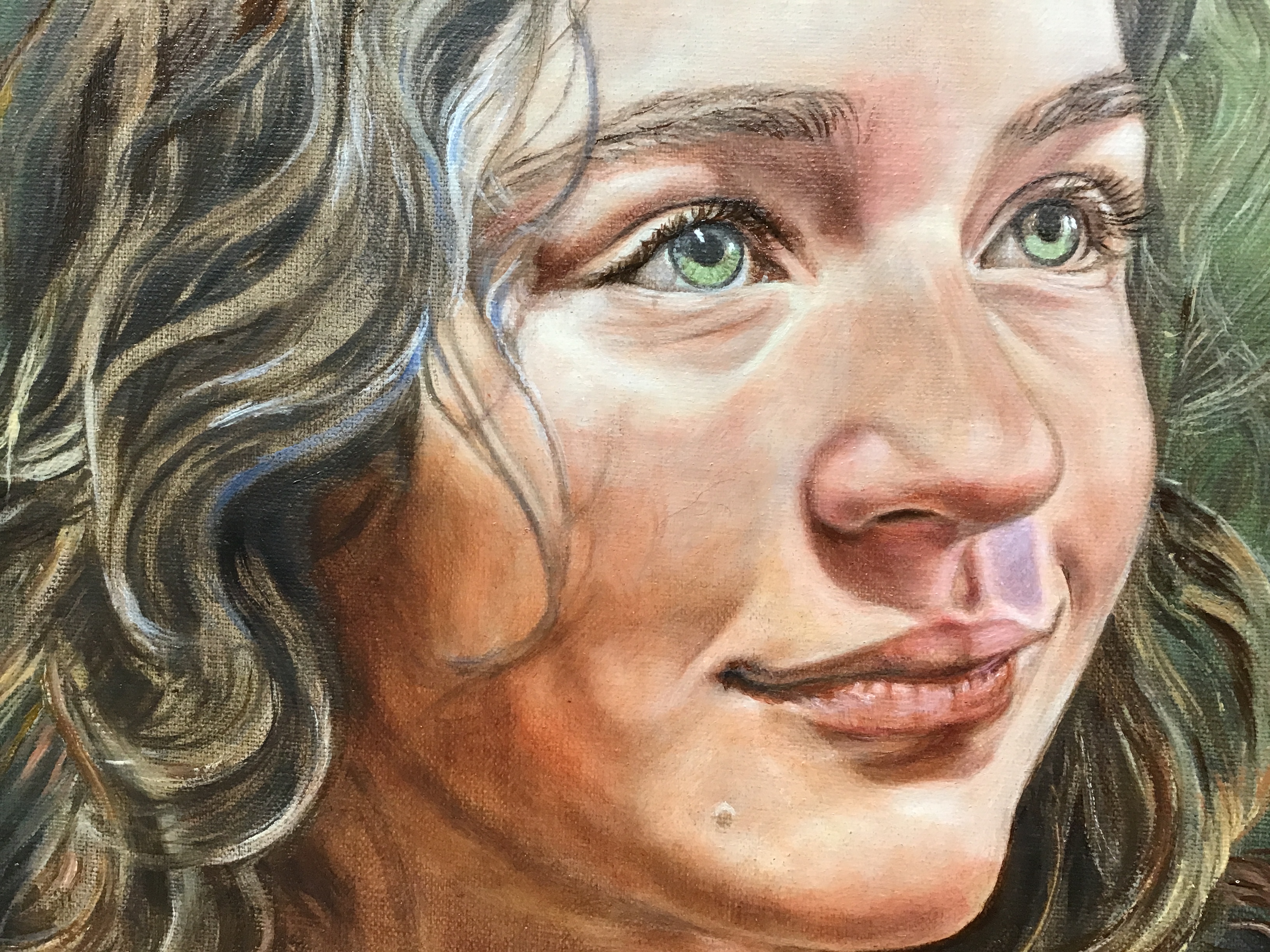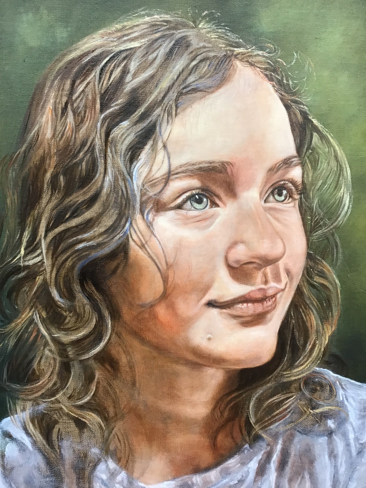 Today I applied a gel/flesh mixture and buffed to renew the painting surface and deepen the skin. After that, using a tiny filbert sable with a good point, I methodically went over a lot of the details. Students ask, ’what first?’ but that must be decided by the artist and sometimes dictated by what simply must come first. I would never paint the dark pupils and then go back to add the iris details. Yes, it could be done, but it seems to make sense that the dark pupil would go on last. I indicate where it should be by painting an under layer in an earlier step, but that last dark layer finalizes it all. I tell my students to let everything dry before that last mark so that it can be taken of easily if a mistake is made. When an artist is more confident, then they move ahead as they trust their decisions. I will still add more darks in the hair shadows and lift the brights of the flesh even more. At this point, my focus is on the likeness which can be a minute, tiny mark to bring perfection. Note the tiny hair shadows on forehead and cheek and the changes in the background color. Soon, I will play with the hair, which my granddaughter insists must be blue!!! This IS beginning to have that magic quality. If I allow it to dry over night, maybe the elves will come and make it even better😉 Diana