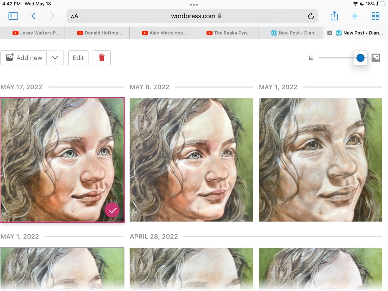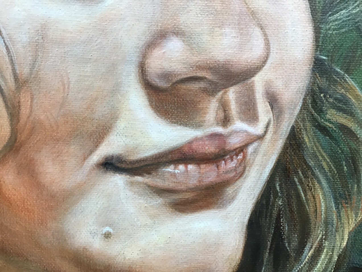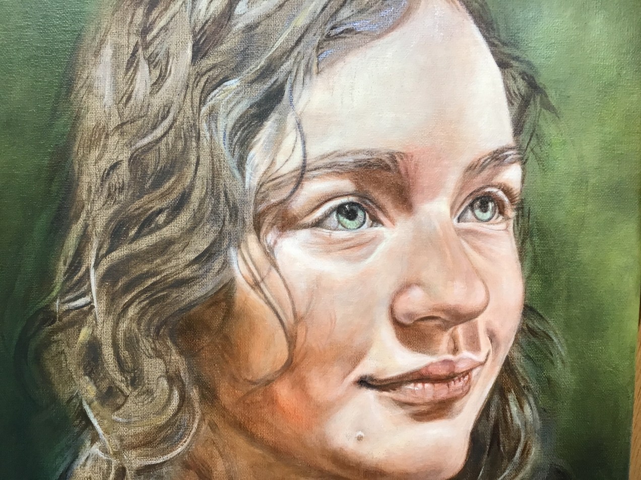 Today I applied a gel/flesh mixture and buffed to renew the painting surface and deepen the skin. After that, using a tiny filbert sable with a good point, I methodically went over a lot of the details. Students ask, ’what first?’ but that must be decided by the artist and sometimes dictated by what simply must come first. I would never paint the dark pupils and then go back to add the iris details. Yes, it could be done, but it seems to make sense that the dark pupil would go on last. I indicate where it should be by painting an under layer in an earlier step, but that last dark layer finalizes it all. I tell my students to let everything dry before that last mark so that it can be taken of easily if a mistake is made. When an artist is more confident, then they move ahead as they trust their decisions. I will still add more darks in the hair shadows and lift the brights of the flesh even more. At this point, my focus is on the likeness which can be a minute, tiny mark to bring perfection. Note the tiny hair shadows on forehead and cheek and the changes in the background color. Soon, I will play with the hair, which my granddaughter insists must be blue!!! This IS beginning to have that magic quality. If I allow it to dry over night, maybe the elves will come and make it even better😉 Diana