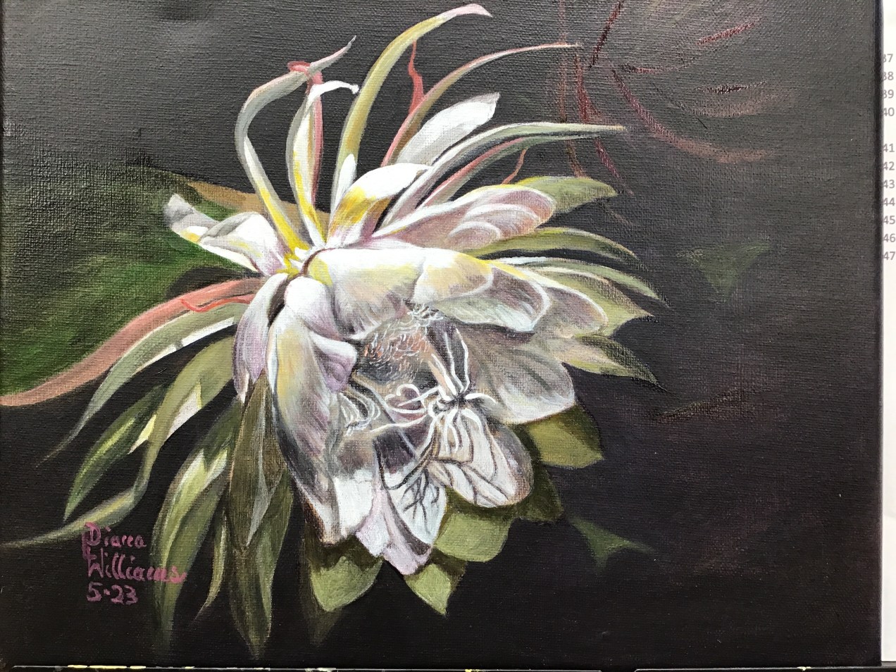 Here is an 8×10 of a Night Blooming Cereus which I painted in order to have something to donate to a local art group. This took a lot of work even though it is a small image. I am enjoying this flower so much, I am considering doing a multiple for a larger format. I have so much going on at the moment that it is challenging to keep up. My gardens are better than expected since I couldn’t find anyone to help clean them off until after their robust sprig growth had already over taken them. It didn’t seem to slow them down.
