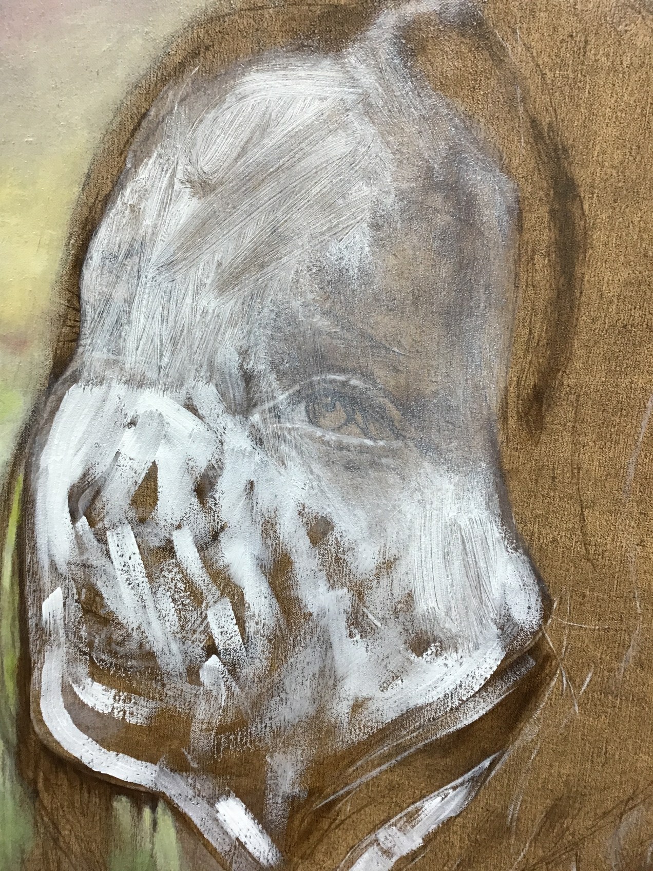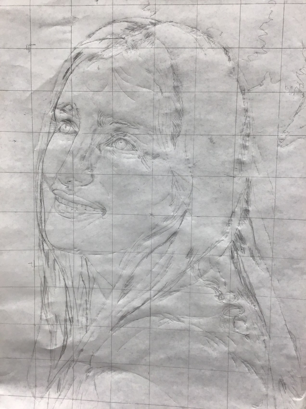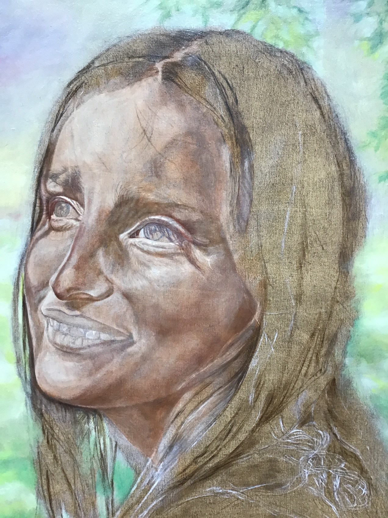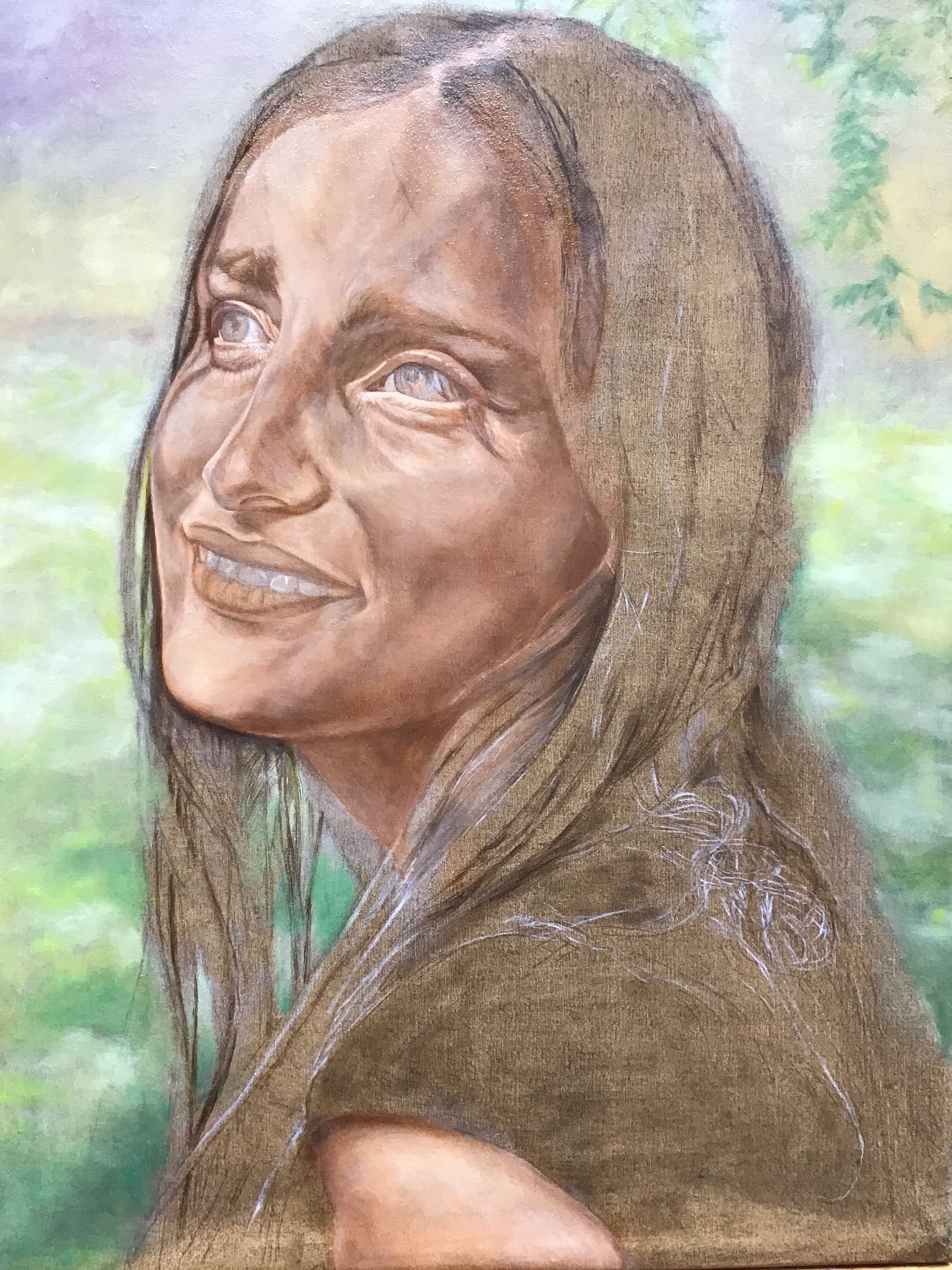 Usually I don’t add detail at this stage but this girls eyes are the entire focus of the painting. They have to be perfect or I will have failed to capture a truly descriptive image. When adding minute detail at this point in the process it is important to use just the right amount of strength of value; not too dark, not too light. These marks will hold the place as I add layer after layer. They will still be visible when I need to finish the work. Their presence under the layers will add a shadow of reality under the fresh top strokes. I am sitting in front of this canvas that was bare three days ago. Already there is a radiance glowing from the spirit represented here. This is what excites my students and helps them get past the struggle! HalleluYah! I am so thankful to be able to make it to my studio every day and even for the new/old med that my doctor gave me to control my tremors. I am blessed.