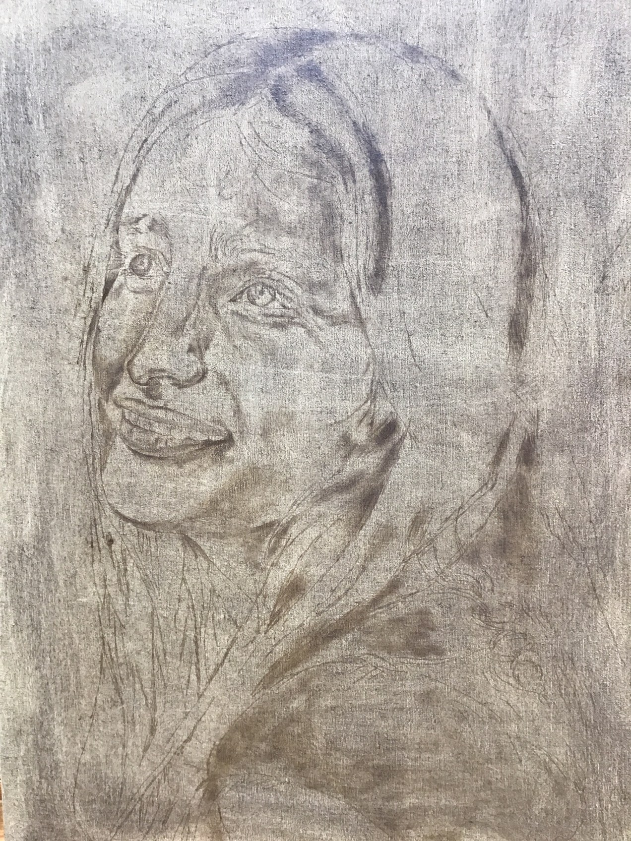 I hope I have managed to insert two images of the raw beginning of this portrait. The first is the drawing, if indeed it shows up first. I worked on this for about four days, from two to three hours each day. It is one of the types of images that I hope to do justice to the light, especially in the eyes, which are the focus of this painting. I spent hours just studying the placement and shape but later it will be the colors and light that will challenge me. The next image is the transfer to the canvas. Upon completing the transfer, I make an effort to soften the lines and shadows, adding more of the same color that I used for the transfer. I do this to add detail or shading wherever needed. On my next post, I will show you today’s work. I have painted in the most prominent brights. In this way, both the shadows and the light are established and corrected from the beginning. I do hope you enjoy watching the steps to creating what will probably be entitled, ‘Argentine Eyes’ Shalom, Peace, Diana