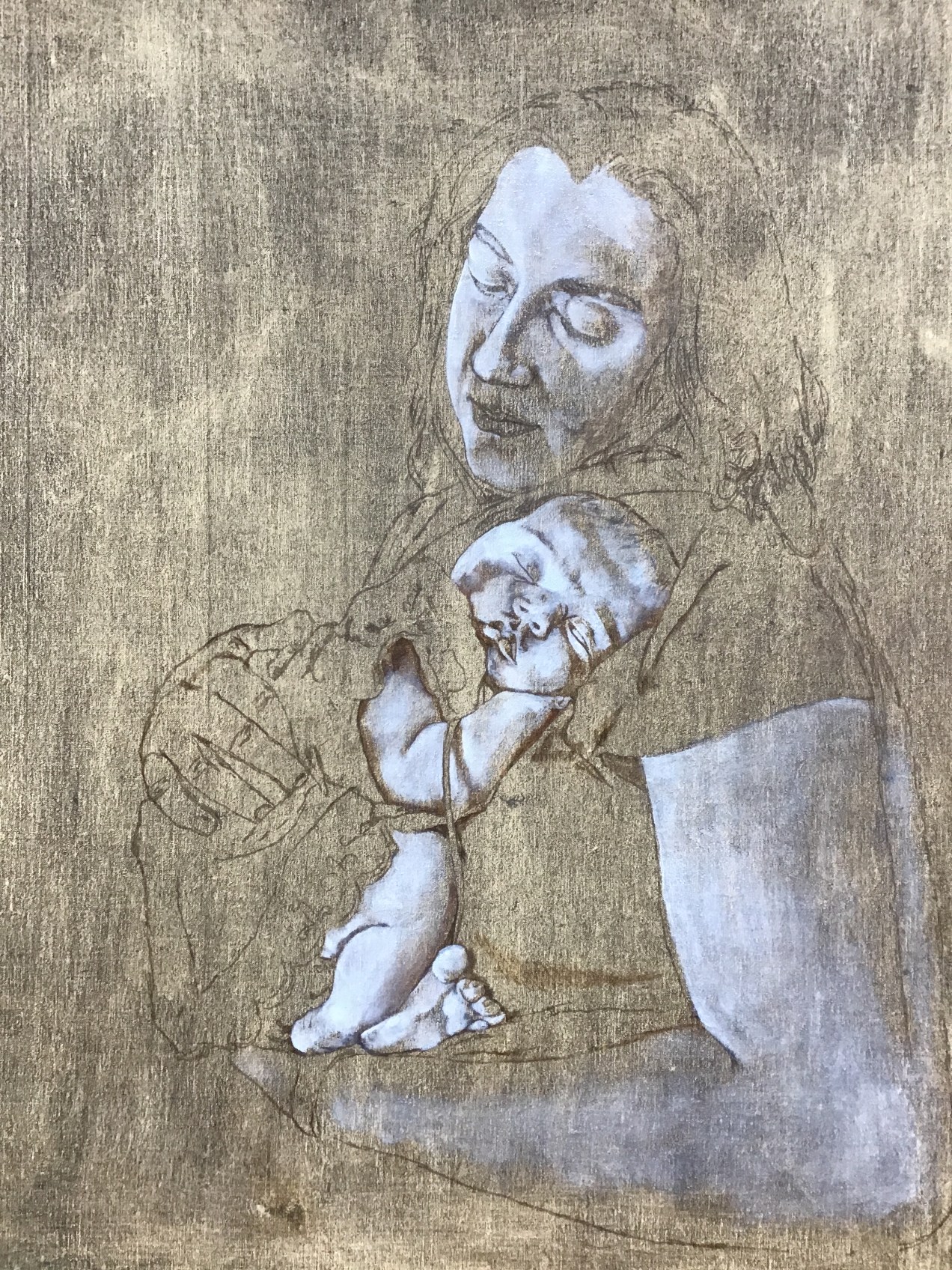 I loaded two photos and inserted them both, I don’t know if they will both show up and I won’t know until I post this. I have been painting some smalls for a show featuring smalls to sell. I enjoy these even though I have always concentrated on life size portraits which is the image I am posting today. I found a beautiful frame at a thrift shop in Ohio a few years ago. I thought this mother and baby should really look good in the frame. Since this frame is a size that is not standard, I would have to pay a high price for a custom made linen canvas. So, I decided to make my first attempt at constructing an archival linen canvas panel. My husband bought a piece of birch plywood and cut it to fit the frame I mentioned. I painted it with a sealant and then cut pre primed linen which I glued carefully to the panel using a special archival glue. After it was dry, I painted the imprimatura layer using a mixture of burnt umber and ultra marine blue, wiping it down to the shade and value I wanted. I transferred the drawing as I have shown you before and then I emphasized the darks with the same paint I had used for the imprimatura. When dry, I used a lead white equally mixed with titanium white to begin marking the brights to established the three dimensionality of the image. I always try to make photos of every stage of the portrait painting. If both of the images show up here you will be able to see the progress of this procedure. This process is one of the most important parts of making a painting in a style of realism. It can be a slow process for students to master this stage. It takes an artistic trained eye to see the value shifts in flesh tones as well as clothing and background; even more skill to show this on the canvas with paint using only the pressure of the brush or a heavier application of the paint. These are the kinds of things we discuss and practice in our class. I have been greatly blessed to be learning these skills. My students are excited and encouraged as they begin to see results and improve these skills. I try to post often when I am actively working on a painting so that my viewers can give this a try too with the examples to guide them. I hope you all find this as rewarding as I do. Till next time, Shalom, Diana