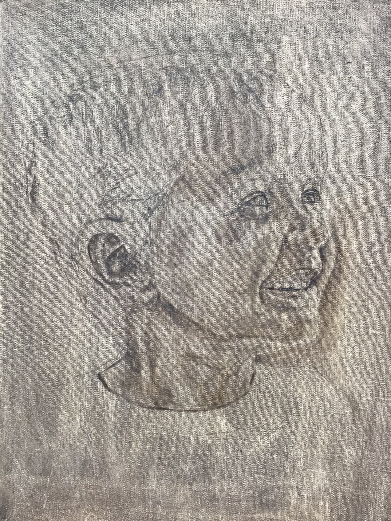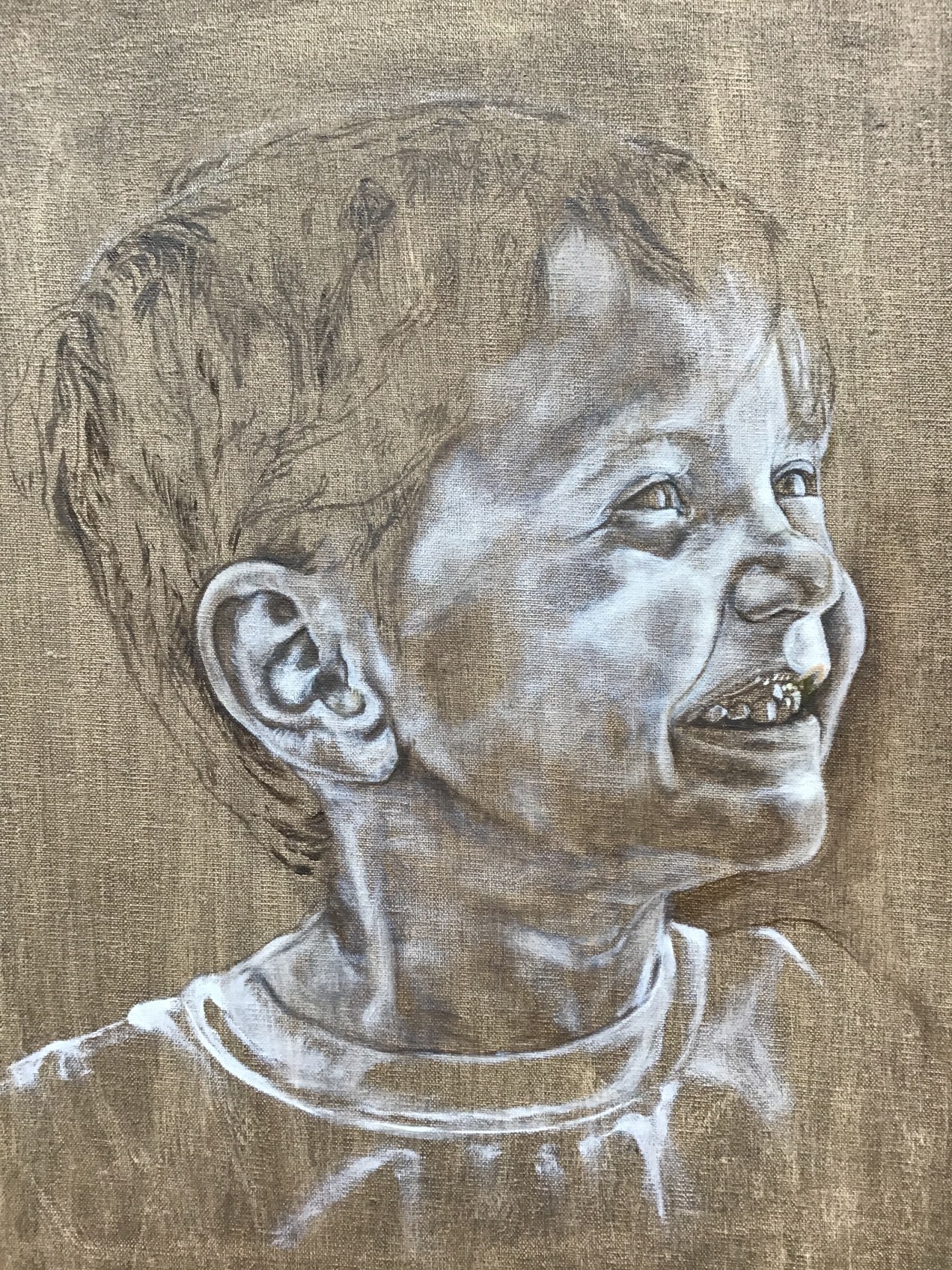 ok, I will try to calm down. I just got warmed up and settled down from being out in the cold night staring up at the planet parade. I was able to see the brightest planets but they were not as close to each other as I was expecting. I hope some of you took advantage of this celestial sign as it isn’t to happen again in our lifetime. This is a great grandson. I love the light in this. He has a great smile with tiny dimples in this view. These details are necessary for the likeness but it isn’t so simple to get them right. This grisaille is the first layer after the transfer. This is the best time to capture the image of the person, the likeness, personality, spirit. I started my art life painting large and I still love to do that. But there is a special connection when painting a head and shoulders, a closeness and special deep understanding of the features. I feel privileged to have this opportunity with each one. I do hope these will be valued and protected for generations. As I paint these faces, I cannot help but imagine that a hundred years from now, their grandchildren will view these paintings and. have an appreciation for the efforts and love with which I have painted each brushstroke. Shalom, Diana