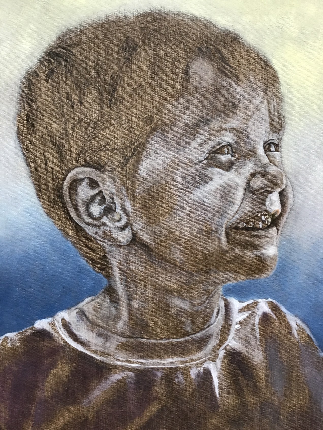 I tell my students that, in most cases, jurors do not wish to recognize ‘cutsie’ images. I say, If you choose to paint an image that might be in that category, then it must have something special about it; something that just can’t be overlooked. In this image, the adorable rosy cheeked infant is front and center with the one little pink foot facing the juror. Mom is glancing lovingly with a firm caress. The dark, simple background evokes a quiet night. Even the angle of the adoring mama’s face directs you to the slumbering child. And the colors are chosen to make the baby in white the center of attention. The life-sized image cannot be ignored. This portrait is meant to make you, the viewer, want to reach out and transfer this sweet bundle into your own arms. I am praying that my artists hand will give this portrait the magic touch it deserves.