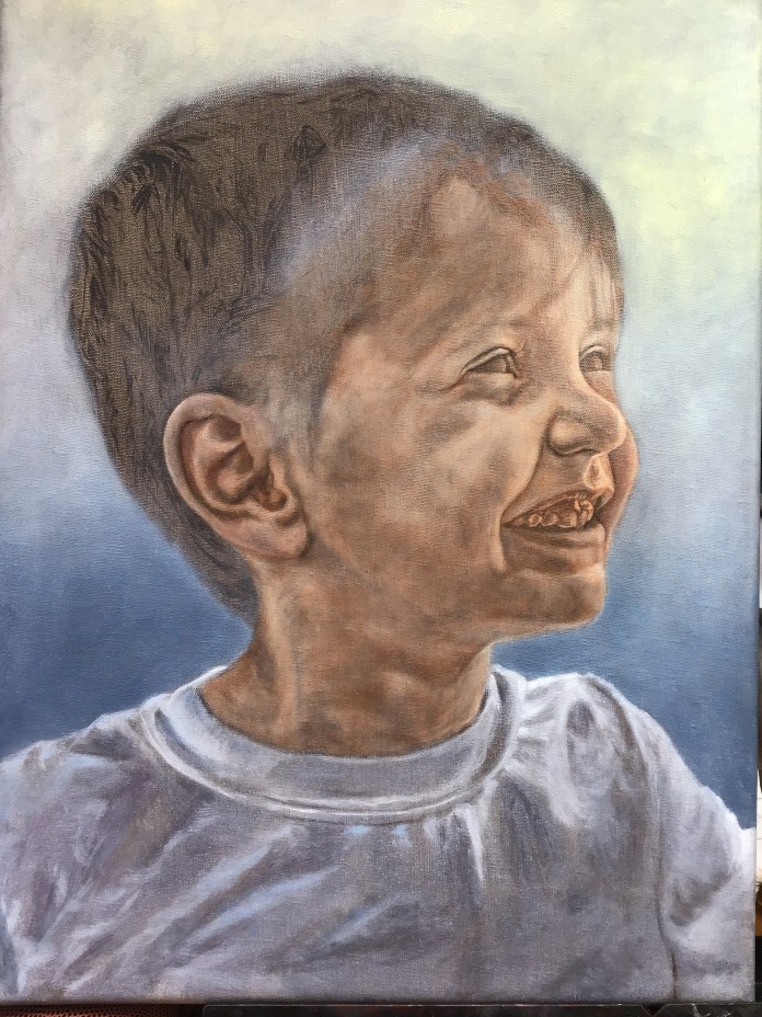I hate to say it but this is difficult. This is because you have to know it inside yourself and have confidence that the marks you make with white, yellow or even darks are truly going to sculpt the image and make it look alive! Then, you must do it again, but you have the pattern in front of you. If worse comes to worse, you can wipe it all off and start over tomorrow. I tell my students, ‘if it doesn’t look right, it is just not finished!’ This looks better, hopefully, on the next pass, it will be finished. Well, I still have the hair and the shirt. It will be interesting because the light in the shadows is a glowing cerulean blue. That will be a challenge. This is the part that I need to show my students. Enjoy your painting. Shalom, Diana