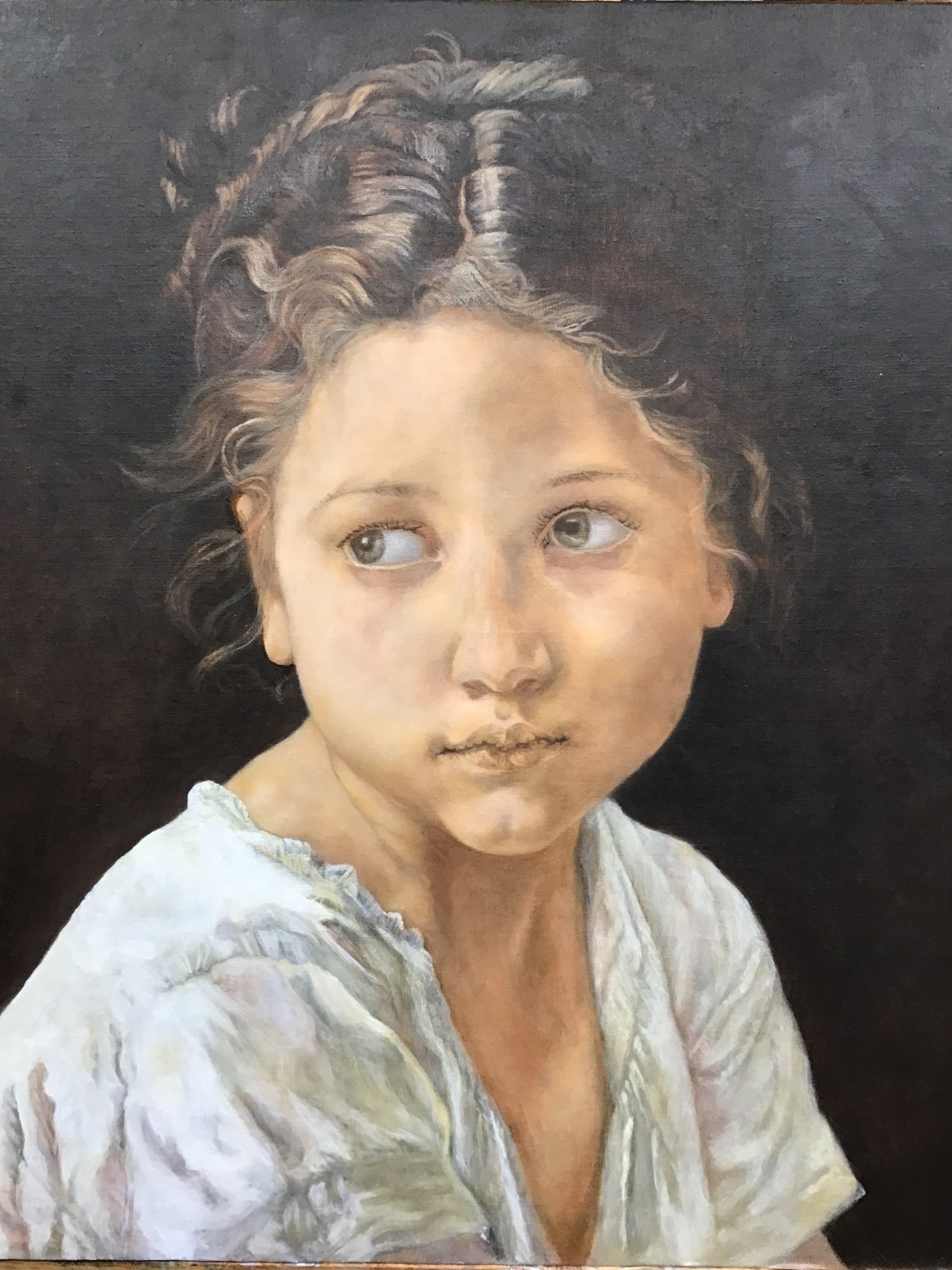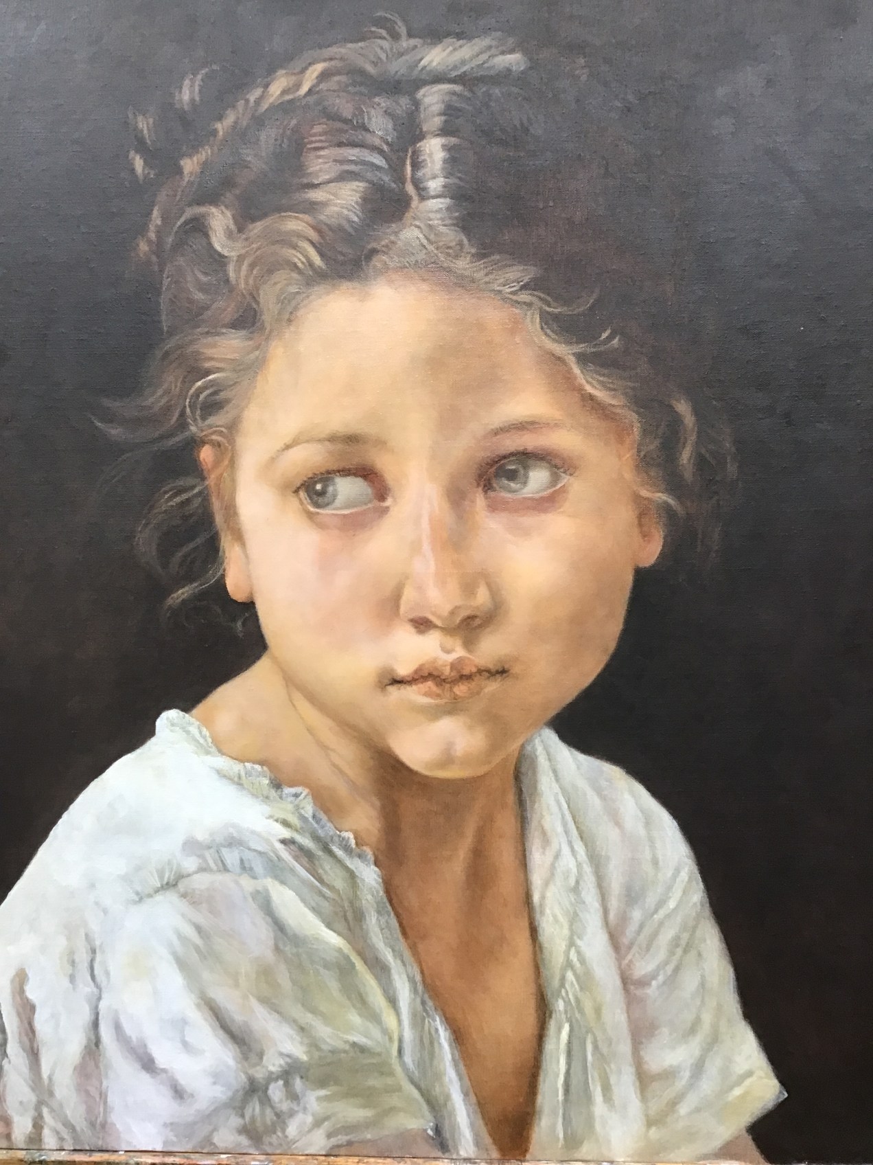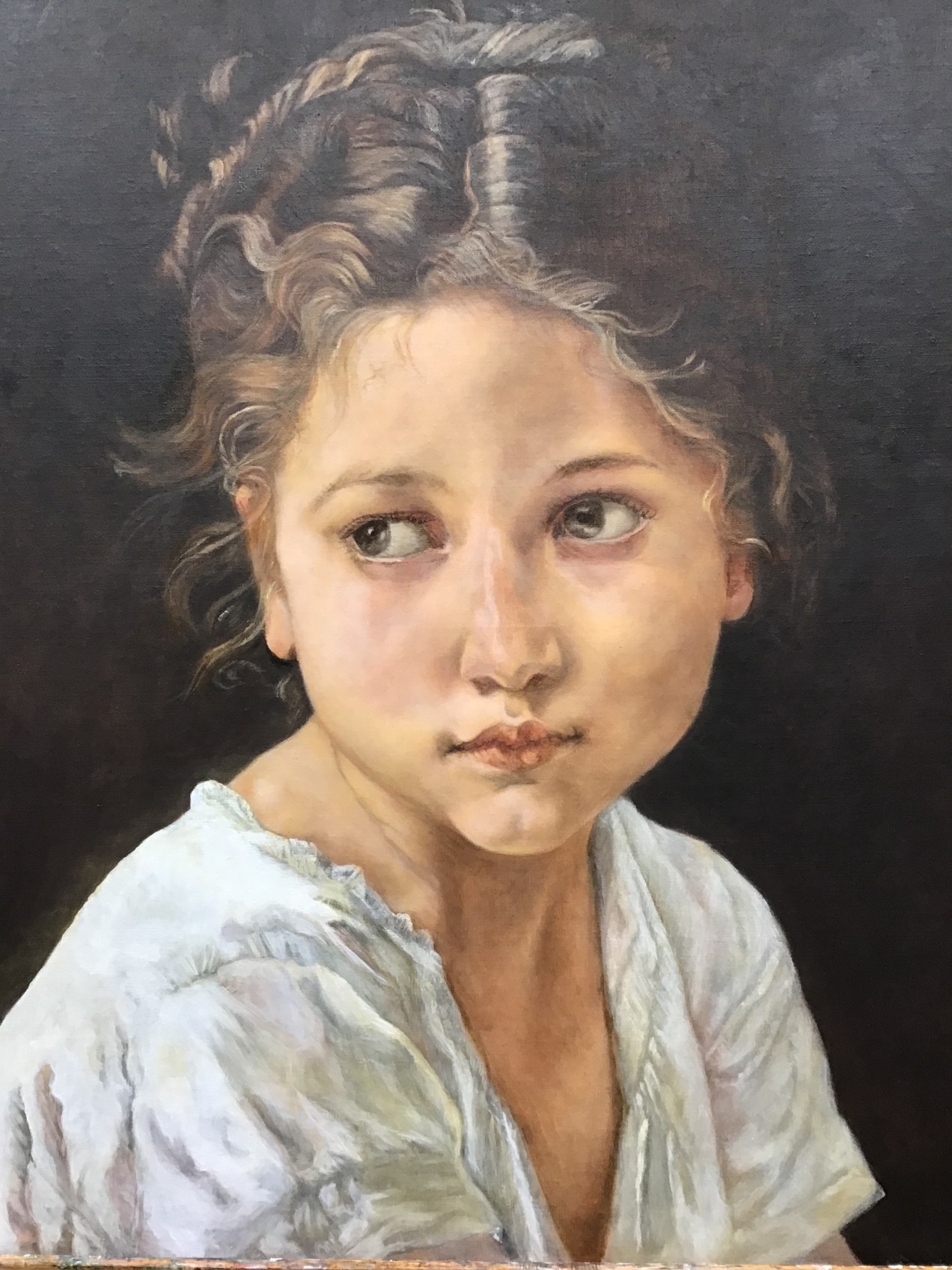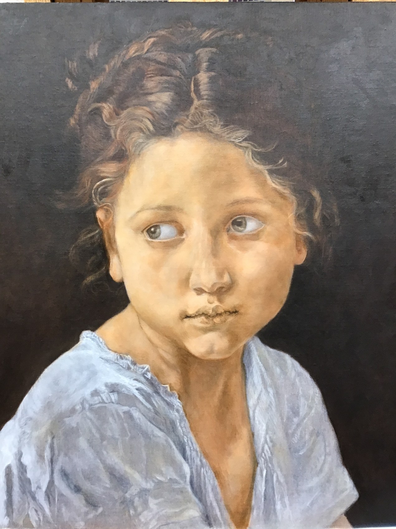 Today I worked on the Bouguereau master copy and the portrait of my great granddaughter. Both are at the stage where every mark is important. This is no longer an underpainting. I must be certain of having enough time so that when I begin, I will be able to concentrate and not rush. When achieving a likeness, the slightest move as you mark the canvas determines success or not. Of course, sometimes you can lift a mark and do it again. I just want to emphasize that a spontaneous flourish usually looks better than a mark which you have labored over. Take a deep breath and then hit the target. I hope you are enjoying this Bouguereau as much as I am. It is as though this little girl has appeared again in a different century. I have to admit, Bouguereau’s images are truly compelling.