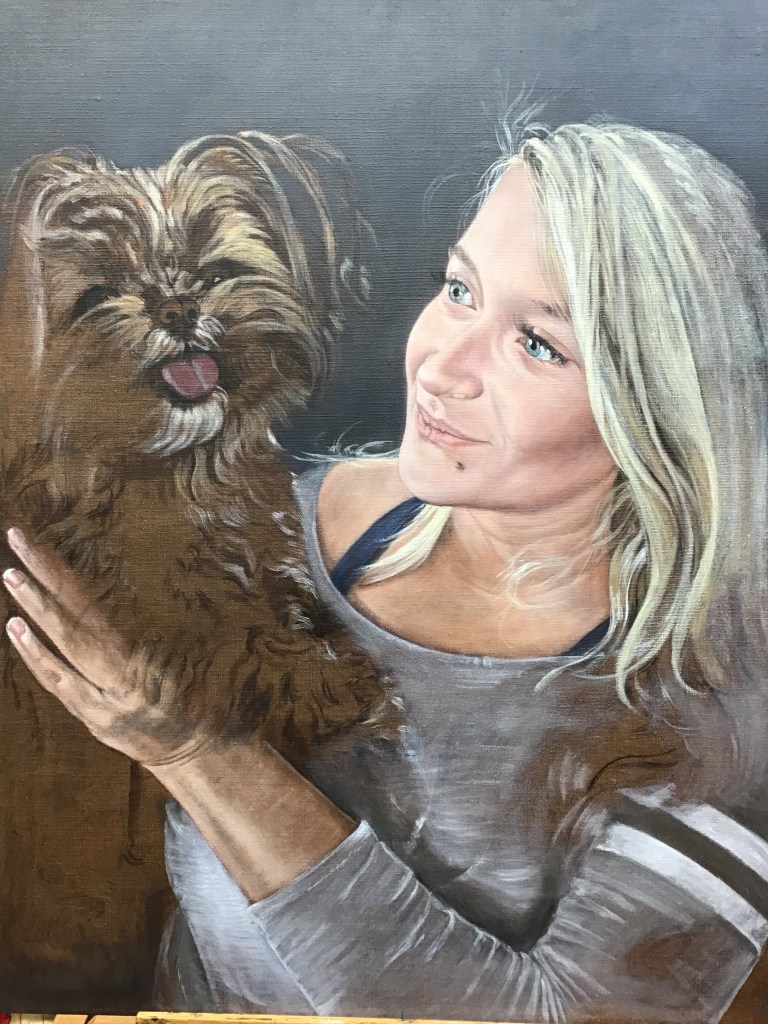 Then, I must complete the hair, the shirt and also emphasize the deep darks in the recesses of folds and other depths to enhance the three dimensional look. Today, I want to work on the dog.