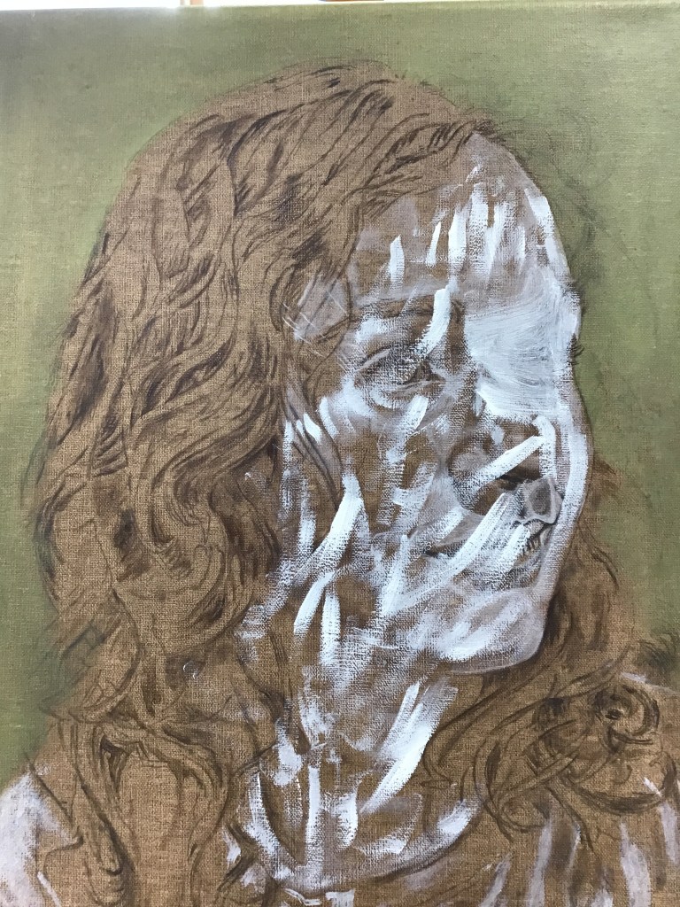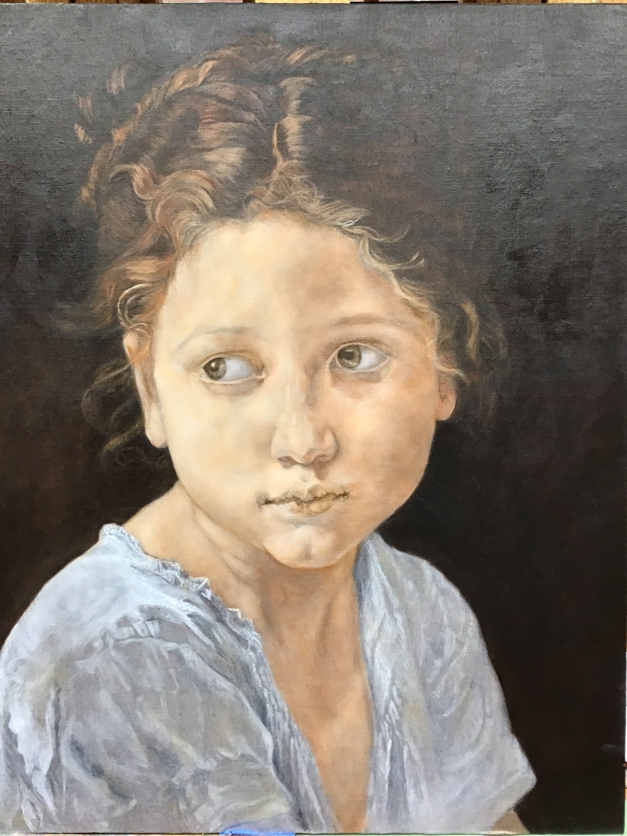 I hate to say it but this is difficult. This is because you have to know it inside yourself and have confidence that the marks you make with white, yellow or even darks are truly going to sculpt the image and make it look alive! Then, you must do it again, but you have the pattern in front of you. If worse comes to worse, you can wipe it all off and start over tomorrow. I tell my students, ‘if it doesn’t look right, it is just not finished!’ This looks better, hopefully, on the next pass, it will be finished. Well, I still have the hair and the shirt. It will be interesting because the light in the shadows is a glowing cerulean blue. That will be a challenge. This is the part that I need to show my students.